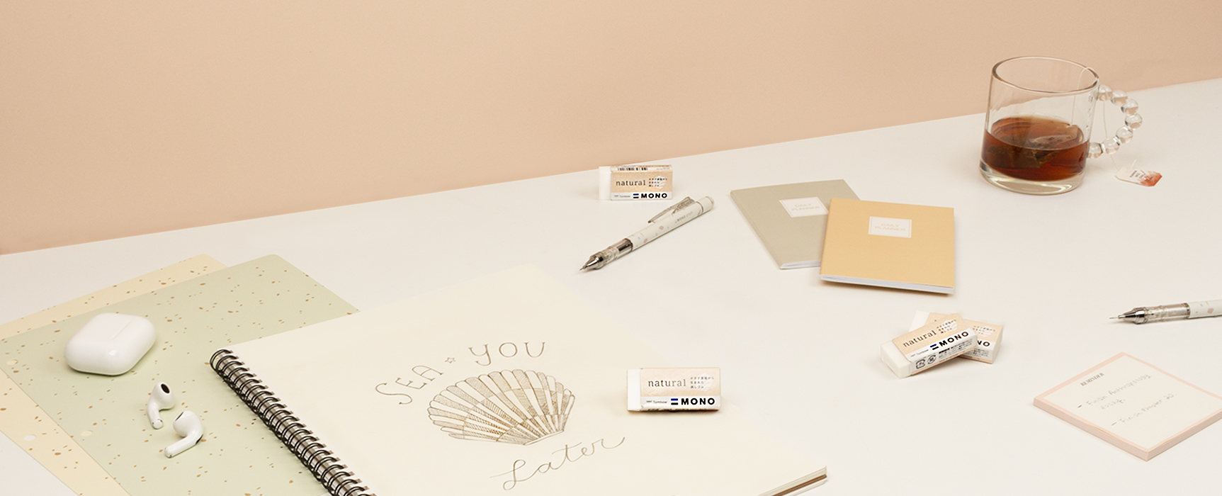 The MONO Natural Eraser matches the high erasing performance of the MONO PE series, with an erasing rate of 95% or more, ensuring clean and smooth erasing without damaging paper. Slightly harder than the MONO PE series, the MONO Natural Eraser produces less eraser dust, providing a clean and smooth eraser feel. is also free from phthalate plasticizers and is made from 70% wastepaper pulp.